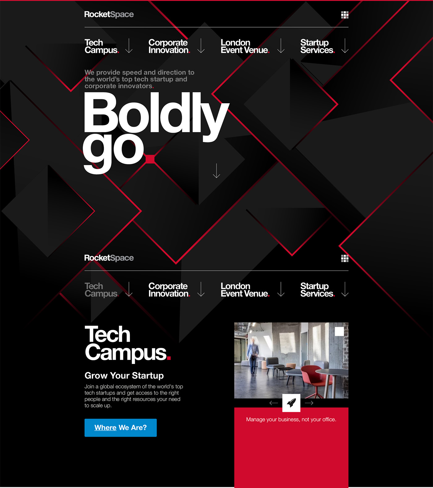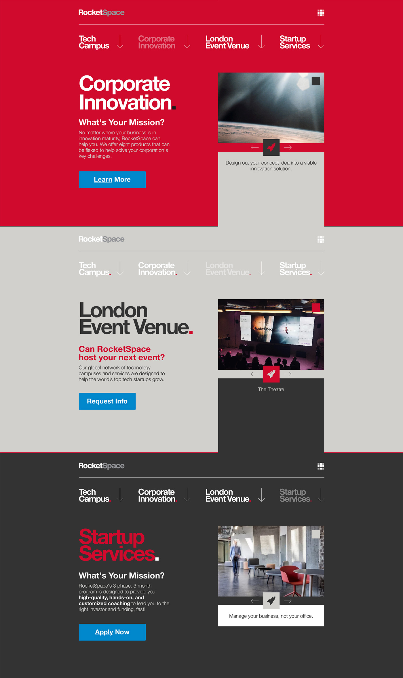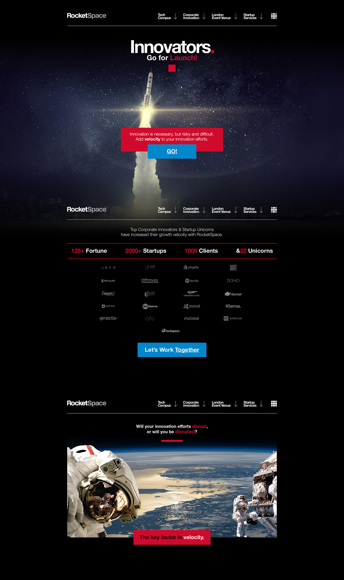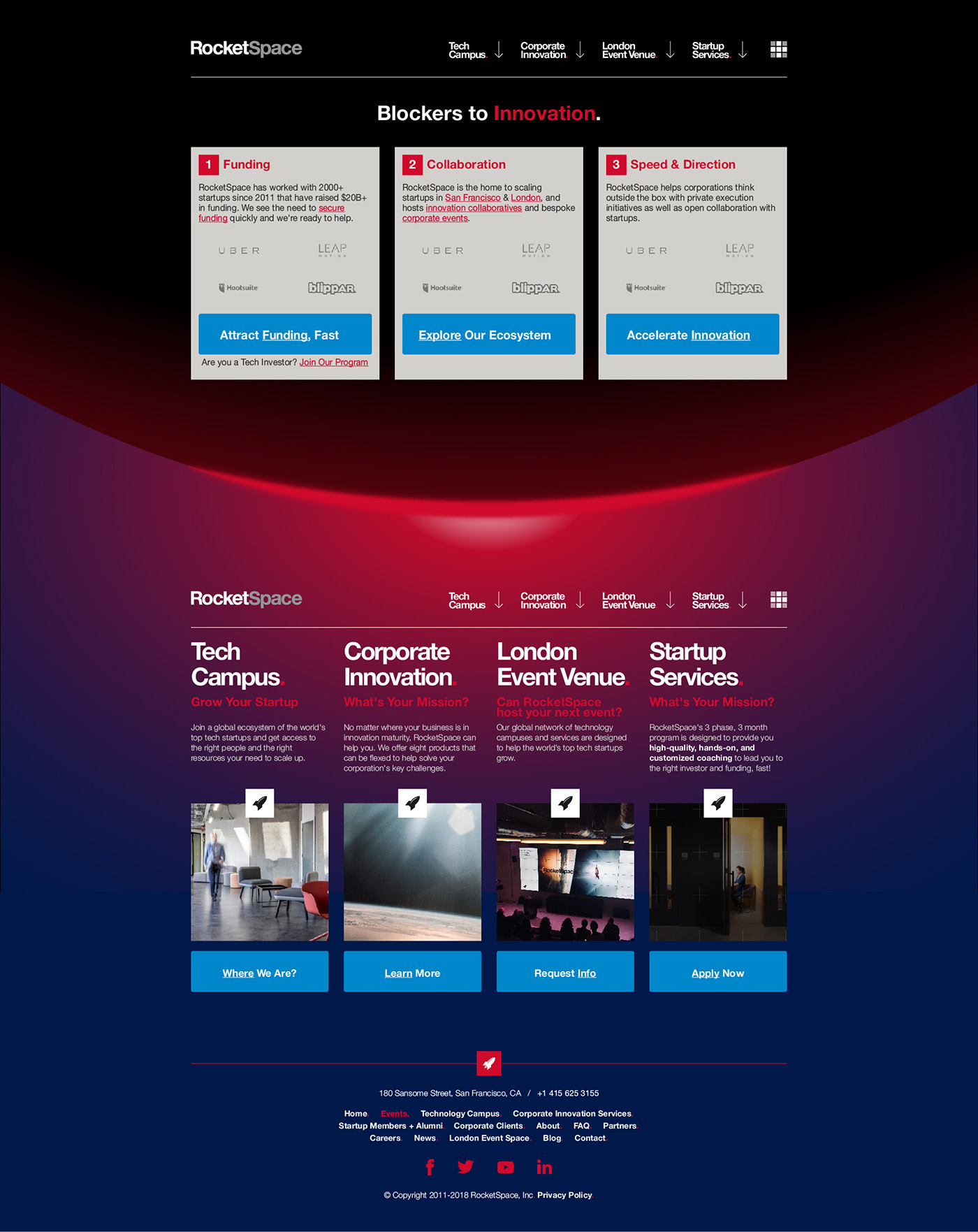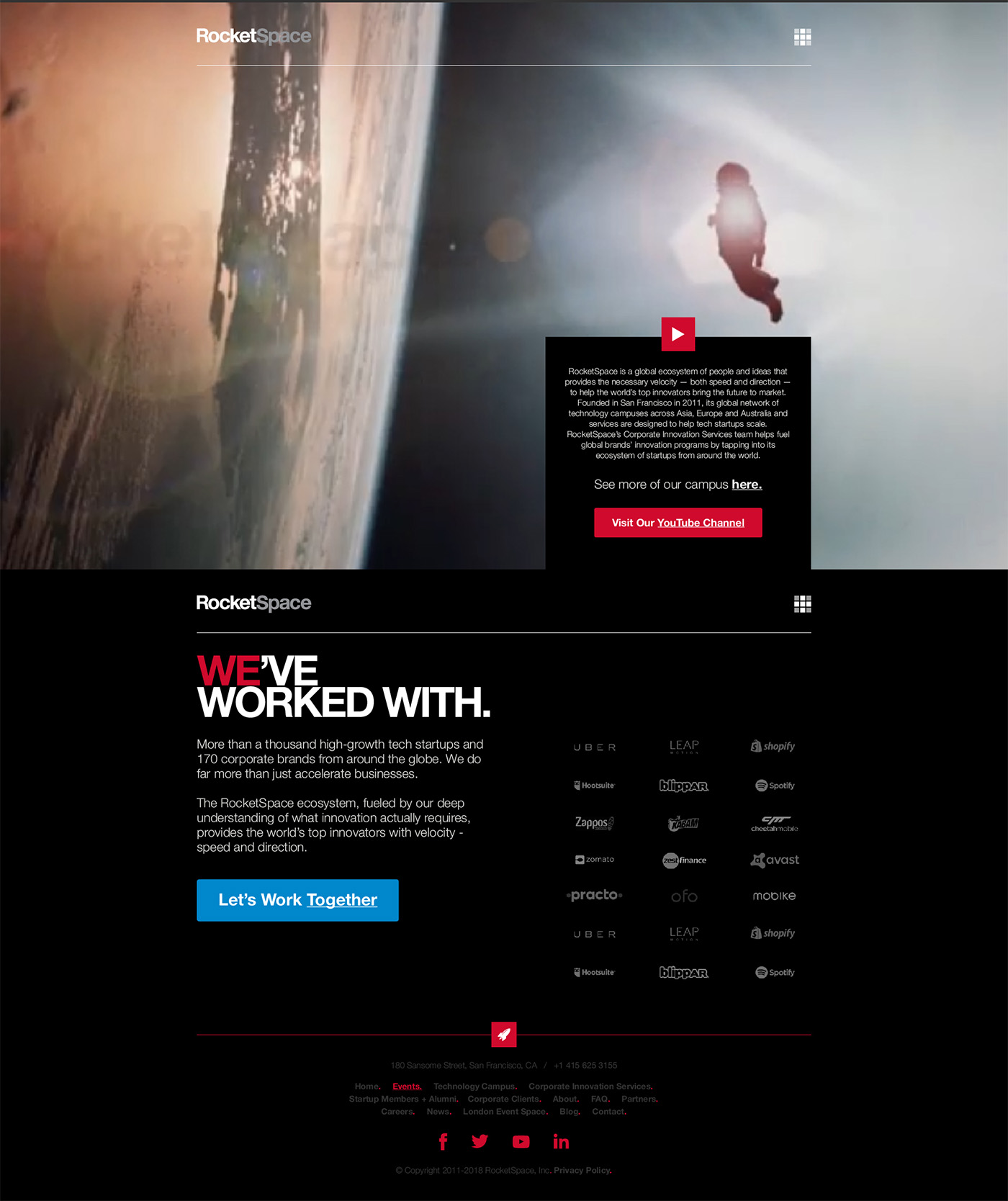 RocketSpace is a hub that connects startups and investors with other entrepreneurs. I made several homepage designs for their proposal.